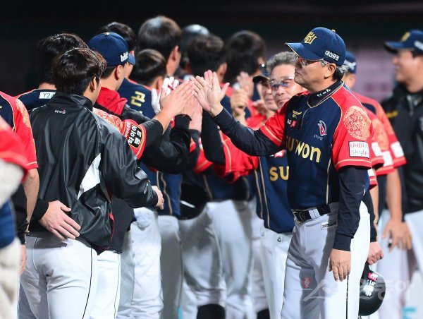 15일 경기도 수원 kt위즈파크에서 열린 ‘2017 타이어뱅크 KBO리그’ kt위즈와 LG트윈스의 경기에서 장성우의 끝내기 안타를 앞세운 kt가 5-4로 승리하며 이틀 연속 LG를 상대로 승리했다. 경기 후 kt 김진욱이 선수들과 하이파이브를 하고 있다. 수원 | 김진환 기자 kwangshin00@donga.com