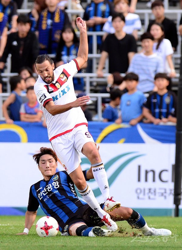 17일 인천 축구전용경기장에서 열린 ‘KEB하나은행 K리그 클래식 2017’ 인천 유나이티드와 FC 서울의 경기에서 서울 데얀이 인천 수비수의 태클을 피해 돌파하고 있다.
