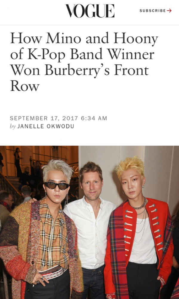 보그는 17일 “한국의 보이그룹 위너의 스타일리시한 두 멤버 송민호, 이승훈이 버버리쇼에 도전했다. 버버리가 2018 스프링 컬렉션에서 선보였던 옷을 입고 도착하자마자 반향을 일으켰다”라며 송민호, 이승훈의 등장을 묘사했다.