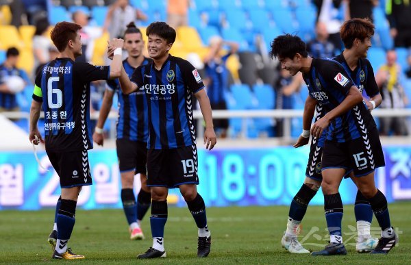 17일 인천 축구전용경기장에서 열린 ‘KEB하나은행 K리그 클래식 2017’ 인천 유나이티드와 FC 서울의 경기에서 인천이 서울에 1-0으로 승리한 뒤 결승골의 주인공 송시우(19)가 동료들과 기쁨을 나누고 있다.