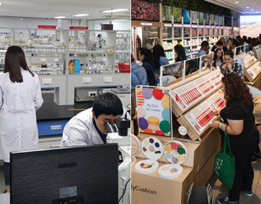 미국 뉴욕에 오픈한 이니스프리 플래그십 스토어를 찾은 현지 고객들(오른쪽)과 서울 논현동 본사로 이전한 잇츠한불 기술연구원 모습. K-뷰티 붐을 타고 승승장구하던 화장품 브랜드숍들은 대내외 환경 변화로 인한 매출 부 진을 극복하기 위해 애쓰고 있다. 사진제공|이니스프리·잇츠한불