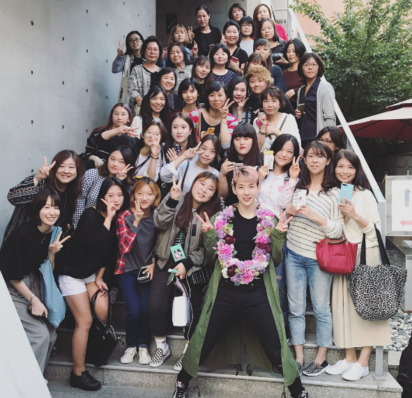 조권은 뮤지컬을 찾아준 팬들과 함께 사진을 찍었다. 팬들 앞에 서서 양 손으로 '브이'자를 하고 다리를 크게 벌리고 있는 모습이 눈에 띈다.
