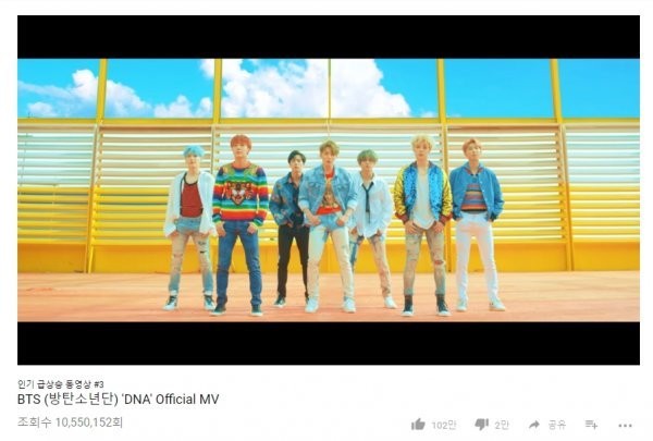 방탄소년단의 ‘DNA’ 뮤직비디오는 지난 18일 오후 6시 공식 유튜브 채널을 통해 공개된 후 8시간 4분만인 19일 오전 2시 4분경 1000만 뷰를 넘었다. 이는 한국 가수 최단 시간 기록이다.
