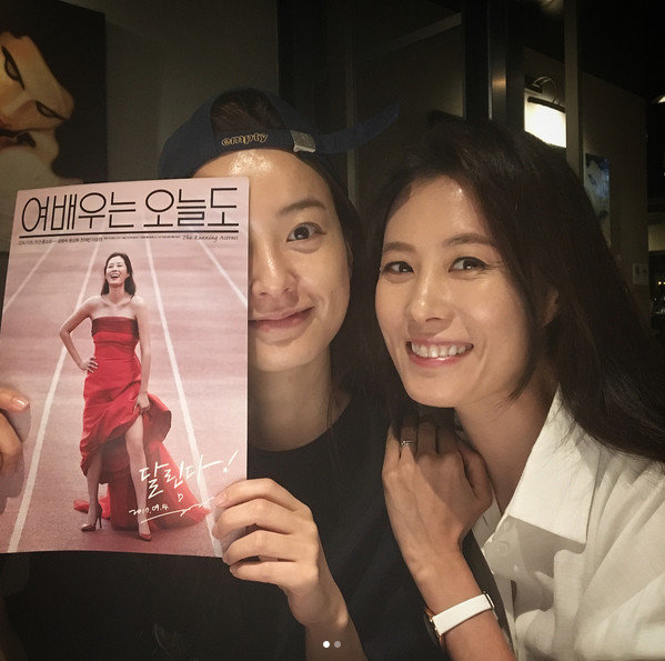 정유미는 19일 자신의 인스타그램에 “우리선배님 소리언니랑 #여배우는오늘도 #감독각본주연문소리 아름답고 존경하고 감사합니다 _뉴미는오늘” 이라는 글과 함께 사진 한 장을 게재했다. 사진 속 정유미는 모자를 거꾸로 쓰고 귀여운 표정으로 영화 포스터를 들고 있으며 문소리는 환한 미소로 카메라를 응시하고 있어 눈길을 끈다.