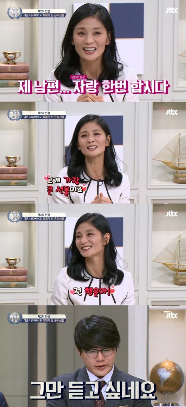 ‘은퇴’를 주제로 토론하던 중 강수진은 남편에게 받은 은퇴선물을 공개하며 “제 남편… 자랑 한번 합시다”라며 애정을 표현했다.