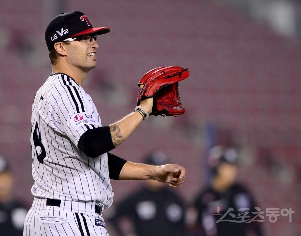 19일 서울 잠실야구장에서 ‘2017 타이어뱅크 KBO리그’ LG트윈스와 kt위즈의 경기가 열렸다. LG 선발 허프가 7회초 무사 1,3루에서 병살타로 위기를 탈출한 후 미소를 짓고 있다.