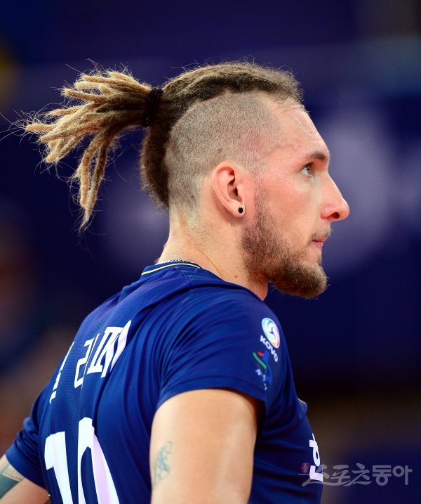 19일 천안유관순체육관에서 열린 ‘2017 천안·넵스컵 프로배구대회’ 남자부 A조 삼성화재와 한국전력 경기에서 한국전력 펠리페가 독특한 머리 모양으로 경기에 임하고 있다.