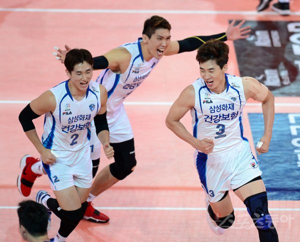 19일 천안유관순체육관에서 열린 ‘2017 천안·넵스컵 프로배구대회’ 남자부 A조 삼성화재와 한국전력 경기에서 삼성화재가 박철우가 공격 득점에 성공한 후 환호하고 있다.