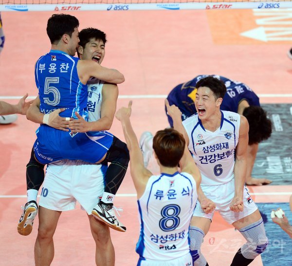 19일 천안유관순체육관에서 열린 ‘2017 천안·넵스컵 프로배구대회’ 남자부 A조 삼성화재와 한국전력 경기에서 삼성화재가 박상하(왼쪽)가 블로킹 득점에 성공한 후 환호하고 있다.