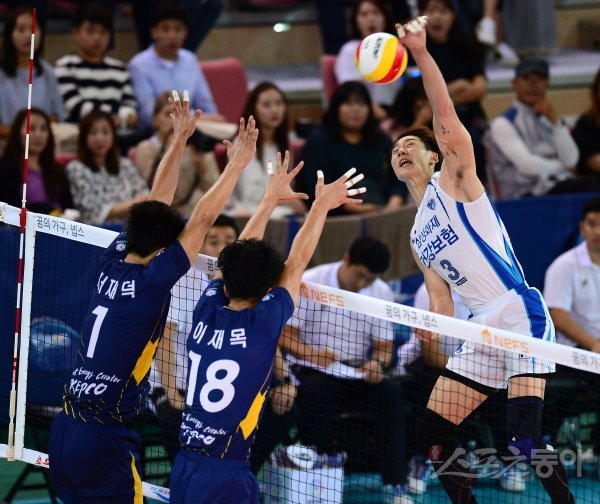 19일 천안유관순체육관에서 열린 ‘2017 천안·넵스컵 프로배구대회’ 남자부 A조 삼성화재와 한국전력 경기에서 삼성화재가 박철우가 한국전력의 블로킹 사이로 스파이크 공격을 하고 있다.
