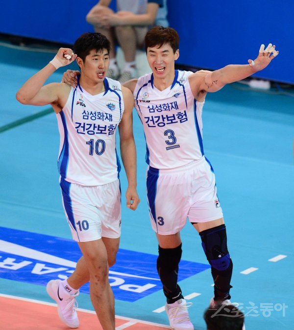 19일 천안유관순체육관에서 열린 ‘2017 천안·넵스컵 프로배구대회’ 남자부 A조 삼성화재와 한국전력 경기에서 삼성화재가 박철우가 공격 득점에 성공한 후 박상하와 기뻐하고 있다.