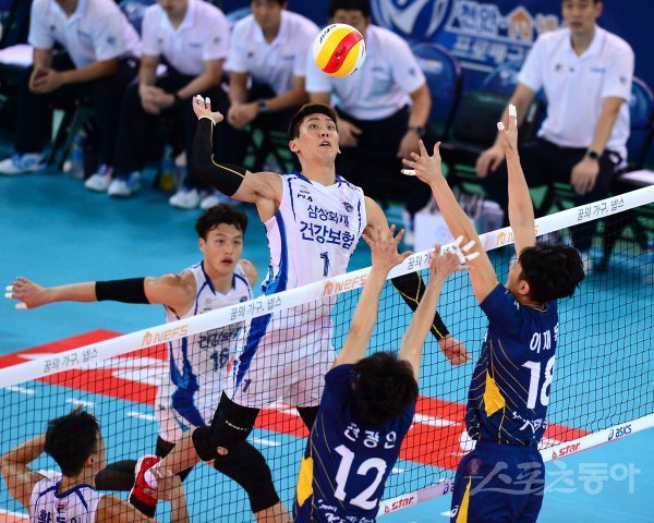 19일 천안유관순체육관에서 열린 ‘2017 천안·넵스컵 프로배구대회’ 남자부 A조 삼성화재와 한국전력 경기에서 삼성화재가 김규민이 한국전력의 블로킹 사이로 스파이크 공격을 하고 있다.