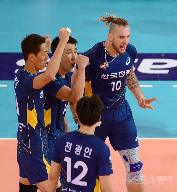 19일 천안유관순체육관에서 열린 ‘2017 천안·넵스컵 프로배구대회’ 남자부 A조 삼성화재와 한국전력 경기에서 한국전력 펠리페가 공격 득점에 성공한 후 환호하고 있다.