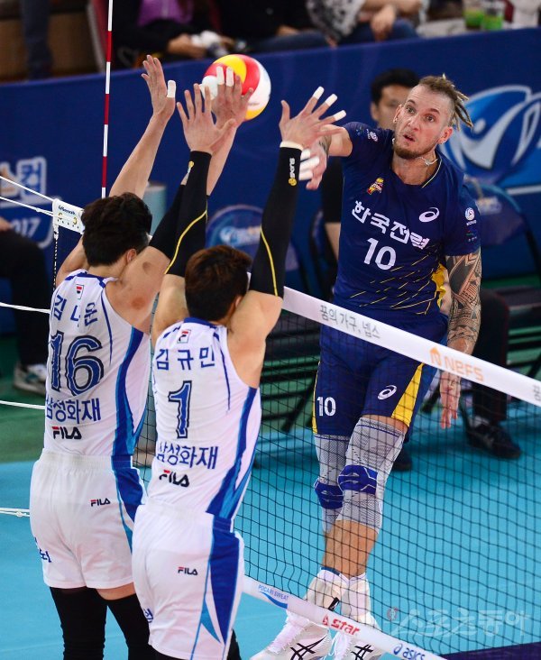 19일 천안유관순체육관에서 열린 ‘2017 천안·넵스컵 프로배구대회’ 남자부 A조 삼성화재와 한국전력 경기에서 한국전력 펠리페가 삼성화재의 블로킹 사이로 스파이크 공격을 하고 있다.