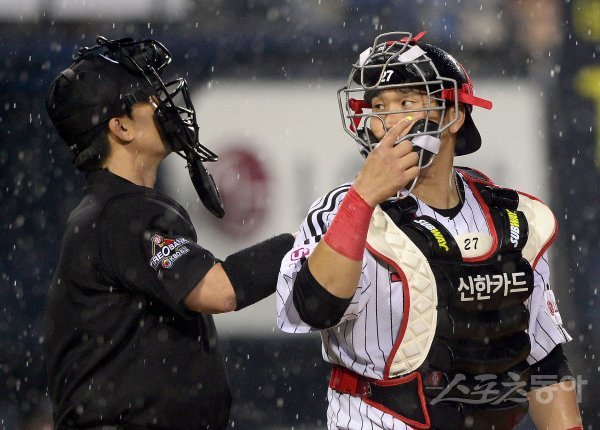 19일 서울 잠실야구장에서 ‘2017 타이어뱅크 KBO리그’ LG트윈스와 kt위즈의 경기가 열렸다. 8회초 1사 1,2루 상황에서 LG 포수 유강남이 김준희 심판에게 비가 많이 온다는 제스처를 취하고 있다.