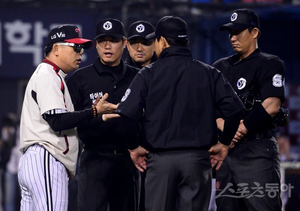 19일 서울 잠실야구장에서 ‘2017 타이어뱅크 KBO리그’ LG트윈스와 kt위즈의 경기가 열렸다. LG 양상문 감독이 8회초 1사 1,2루에서 kt 이진영의 스리런 홈런에 대해 비디오 판독을 요청, 2타점 2루타로 번복되자 심판들에게 어필하고 있다.
