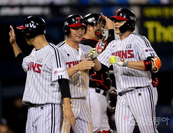 19일 서울 잠실야구장에서 ‘2017 타이어뱅크 KBO리그’ LG트윈스와 kt위즈의 경기가 열렸다. 8회말 2사 1,3루에서 LG 이형종이 kt 주권을 상대로 역전 스리런 홈런을 친 후 오지환의 축하를 받고 있다.