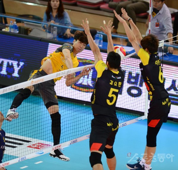 29일 천안유관순체육관에서 열린 ‘2017 천안·넵스컵 프로배구대회’ 남자부 B조 KB손해보험과 OK저축은행 경기에서 KB손해보험 김진만이 OK저축은행의 블로킹 사이로 스파이크 공격을 하고 있다.
