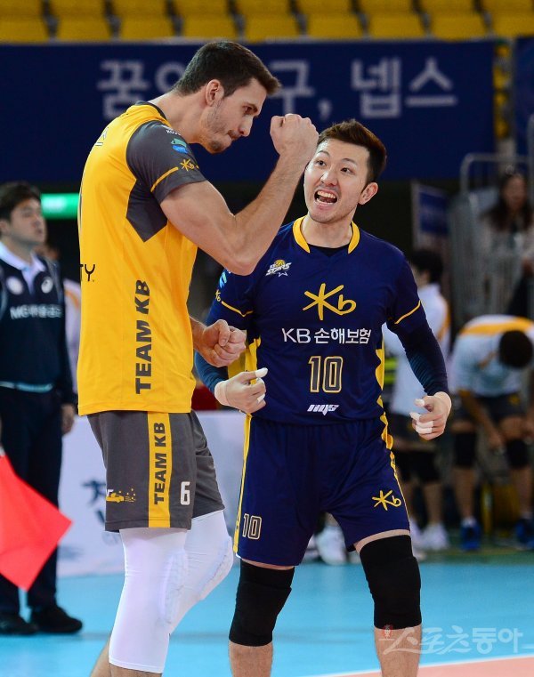 29일 천안유관순체육관에서 열린 ‘2017 천안·넵스컵 프로배구대회’ 남자부 B조 KB손해보험과 OK저축은행 경기에서 KB손해보험 알렉스가 공격 득점에 성공하자 곽동혁이 함께 기뻐하고 있다.