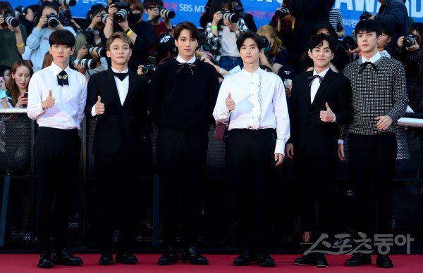 아이돌 그룹 엑소가 20일 서울 송파구 잠실학생체육관에서 열린 ‘2017 제 1회 소리바다 베스트 케이뮤직 어워즈(2017 1st SORIBADA BEST K-MUSIC AWARDS)’ 레드카펫 행사에 참석해 포토타임을 가지고 있다.