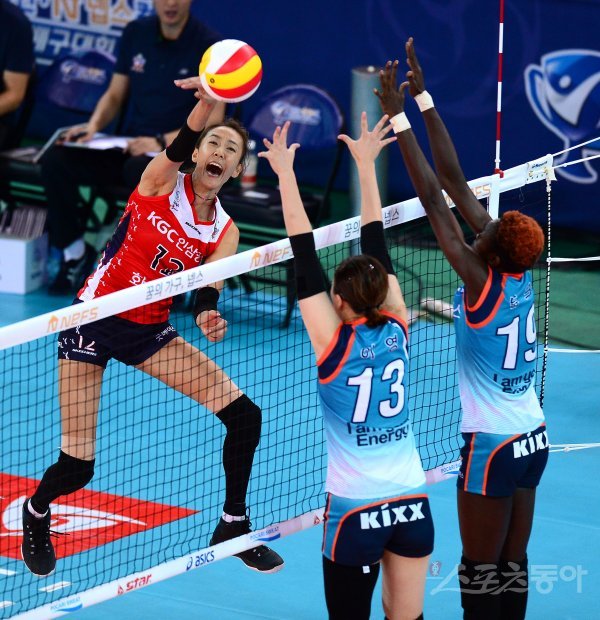 21일 천안유관순체육관에서 열린 ‘2017 천안·넵스컵 프로배구대회’ 여자부 준결승 GS칼텍스와 KGC인삼공사 경기에서 KGC인삼공사 한송이가 GS칼텍스의 블로킹 사이로 스파이크 공격을 하고 있다.