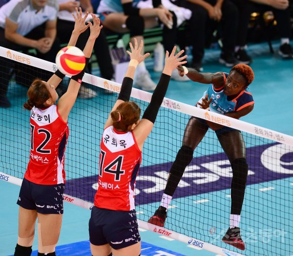 21일 천안유관순체육관에서 열린 ‘2017 천안·넵스컵 프로배구대회’ 여자부 준결승 GS칼텍스와 KGC인삼공사 경기에서 GS칼텍스 듀크가 KGC인삼공사의 블로킹 사이로 스파이크 공격을 하고 있다.