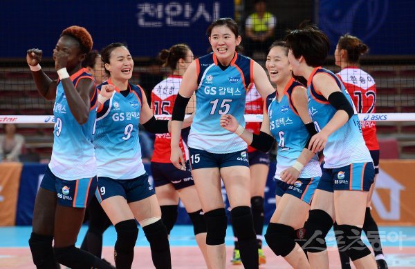 21일 천안유관순체육관에서 열린 ‘2017 천안·넵스컵 프로배구대회’ 여자부 준결승 GS칼텍스와 KGC인삼사 경기에서 GS칼텍스 선수들이 득점에 성공한 후 환호하고 있다.