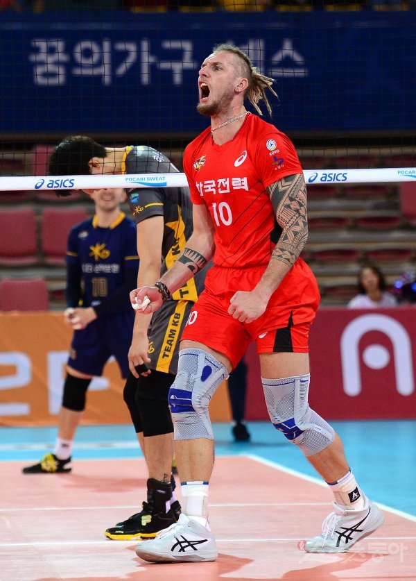 21일 천안유관순체육관에서 열린 ‘2017 천안·넵스컵 프로배구대회’ 남자부 준결승 KB손해보험과 한국전력 경기에서 한국전력 펠리페가 득점에 성공한 후 환호하고 있다.