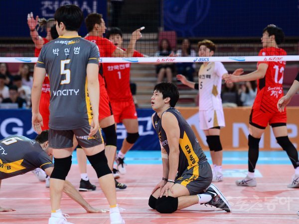 21일 천안유관순체육관에서 열린 ‘2017 천안·넵스컵 프로배구대회’ 남자부 준결승 KB손해보험과 한국전력 경기에서 KB손해보험 이강원이 리시브에 실패한 후 아쉬워하고 있다.