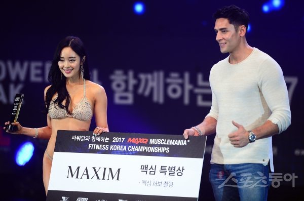 최설화가 23일 서울 광진구 건국대학교 새천년홀에서 열린 ‘2017 맥스큐 머슬마니아 피트니스 챔피언십 한국대회’ 스포츠모델 부문 그랑프리에서 1위를 차지한 후 시상자로 나온 다니엘 강(오른쪽)과 포즈를 취하고 있다.