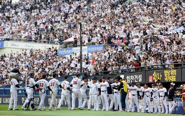 24일 서울 잠실야구장에서 ‘2017 타이어뱅크 KBO리그’ 두산 베어스와 kt 위즈의 경기가 열렸다. 두산이 kt에 6-4로 승리하며 KIA와 공동 1위를 기록한 뒤 선수들이 김태형 감독의 환영을 받고 있다.