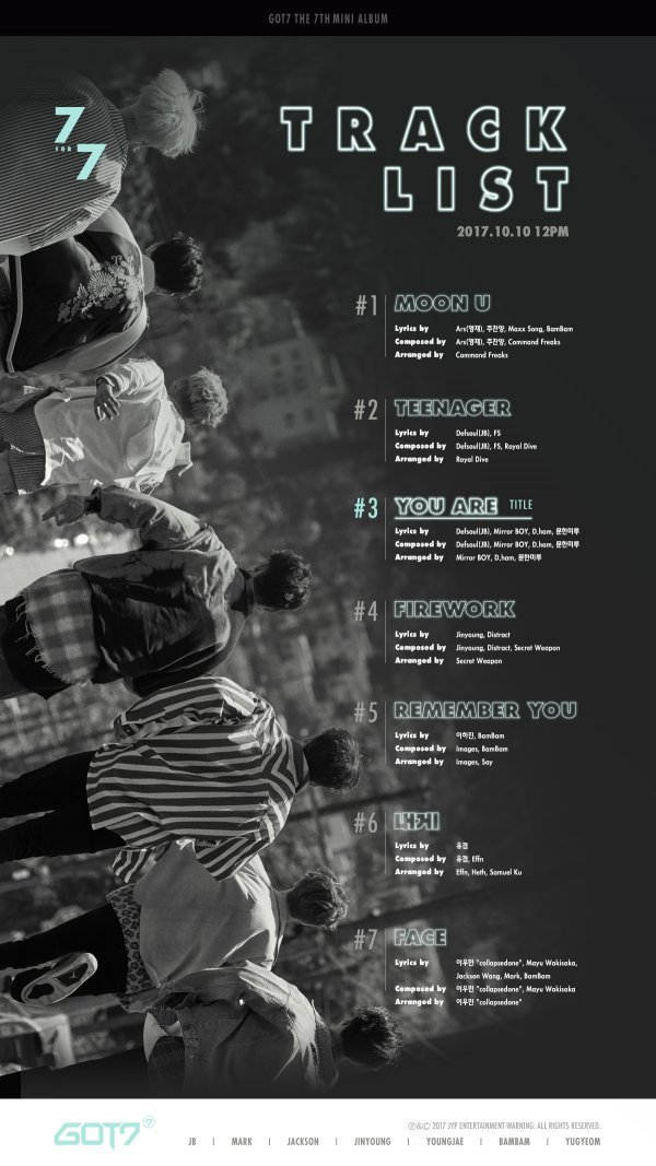 해당 트랙리스트는 GOT7 멤버들이 한 곳을 향해 나아가는 뒷모습을 담아냈다. 이와 함께 리더 JB(Defsoul)의 자작곡이자 신보 타이틀곡 ‘You Are’를 비롯해 영재(Ars)가 작사와 작곡, 뱀뱀이 작사에 참여한 \'Moon U\', JB의 자작곡 ‘Teenager’, 진영의 자작곡 ‘Firework’, 뱀뱀이 작사와 작곡에 참여한 ‘Remember You’, 유겸의 자작곡 ‘내게’, 잭슨과 마크 그리고 뱀뱀이 작사에 참여한 ‘Face’까지 일곱 곡의 크레딧을 공개해 음악적으로도 더욱 성장하며 전진하는 GOT7을 예고했다.