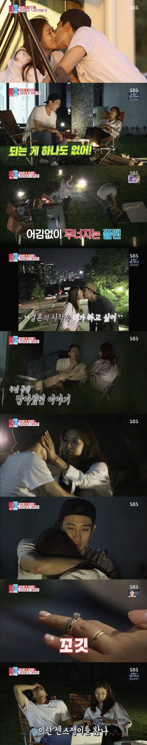 이어 강경준은 "할 수 있는 건 자기한테 마음을 표현하는 거밖에 없더라. 연애의 시작은 자기가 했지만 결혼의 시작은 내가 하고 싶다"고 고백했다. 영상을 본 장신영은 눈물을 쏟았고 그 모습에 강경준 또한 눈시울이 붉어졌다. 이에 두 사람은 서로의 눈물을 닦아주며 "고생했네"라며 애틋한 모습을 보였다. 강경준은 "다른 누구보다 너를 사랑할 수 있고 지켜줄 수 있다"며 "이 말 되게 떨린다. 나랑 결혼해줄래?"라고 청혼했다.