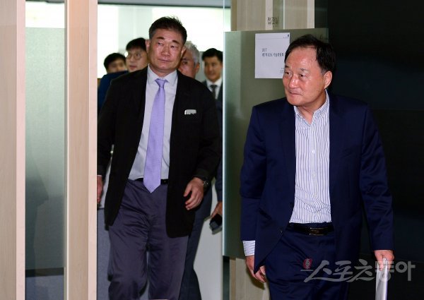 김호곤 기술위원장이 회의장으로 들어서고 있다.