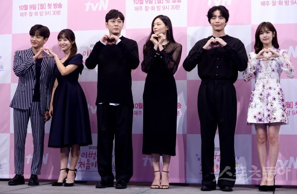 주연 배우들이 26일 서울 강남구 논현동 임피리얼 팰리스 서울에서 열린 tvN 월화드라마 ‘이번 생은 처음이라’ 제작발표회에서 포즈를 취하고 있다. 왼쪽부터 배우 김민석, 김가은, 박병은, 이솜, 이민기, 정소민.