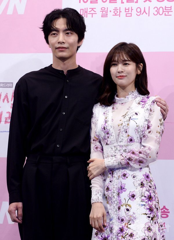 배우 이민기와 정소민(오른쪽)이 26일 서울 강남구 논현동 임피리얼 팰리스 서울에서 열린 tvN 월화드라마 ‘이번 생은 처음이라’ 제작발표회에서 포즈를 취하고 있다.