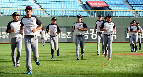 26일 부산 사직야구장에서 ‘2017 타이어뱅크 KBO리그’ 롯데 자이언츠와 한화 이글스의 경기가 열린다. 경기전 한화 선수들이 몸을 풀고 난 뒤 더그아웃으로 향하고 있다.