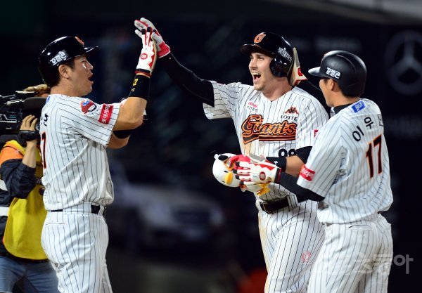 26일 부산 사직야구장에서 ‘2017 타이어뱅크 KBO리그’ 롯데 자이언츠와 한화 이글스의 경기가 열렸다. 6회말 2사 1, 2루에서 롯데 번즈가 한화 박정진을 상대로 좌월 3점 홈런을 쏘아 올린 뒤 동료들의 환영을 받고 있다.
