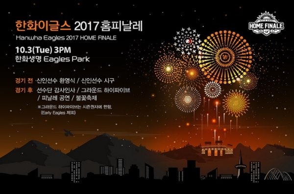 프로야구 한화이글스는 10월 3일(화) 오후 3시 한화생명 이글스파크에서 열리는 NC다이노스와 2017시즌 마지막 홈경기에서 ‘2017 홈 피날레’ 행사를 실시한다.