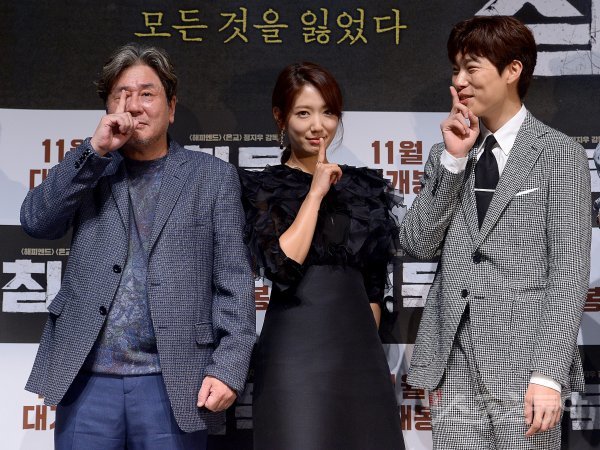 배우 최민식과 박신혜, 류준열(왼쪽부터)이 27일 서울 강남구 신사동 CGV 압구정에서 열린 영화 ‘침묵’ 제작보고회에 참석해 포즈를 취하고 있다.
