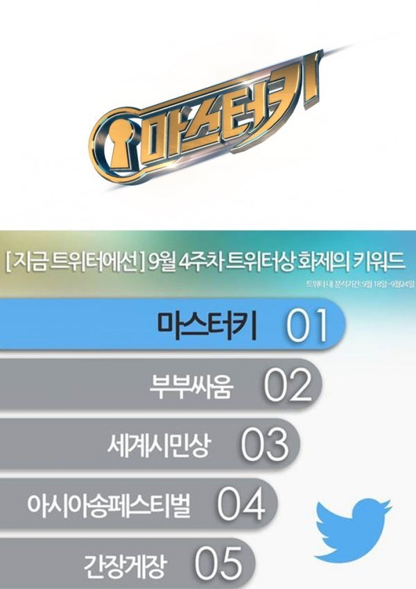 10월 14일 첫 방송되는 ‘마스터키’가 누리꾼들의 뜨거운 관심을 모으고 있다. 트위터 측은 26일 지난 한 주간(9월 18일~9월 24일) 트위터 상에서 가장 이슈가 된 ‘화제의 핫 키워드’를 발표했다. 이 결과에 따르면 지난 주 트위터 상에서 가장 많이 버즈를 발생시킨 키워드 1위는 SBS ‘마스터키’로 조사됐다. 아직 첫 방송도 시작하지 않은 프로그램이 이례적으로 ‘핫키워드’ 1위에 올라 눈길을 끈다.