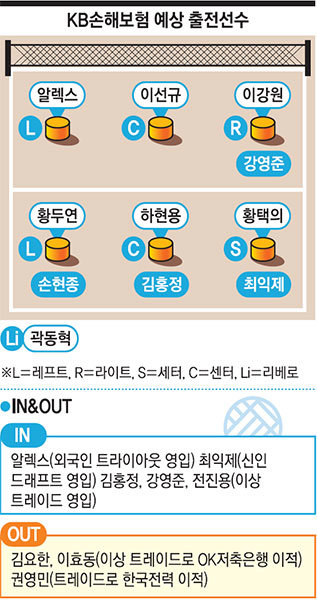 KB손해보험은 배구계의 예상을 깨고, 권순찬 수석코치를 감독으로 전격 승격시켰다. 초보감독에게 변화의 전권을 위임했다. 권 감독은 팀의 얼굴과도 같았던 김요한을 OK저축은행으로 트레이드시켰다. 외국인선수도 공격 전담인 라이트가 아니라 리시브 겸업인 레프트 자원 알렉스를 뽑았다. 김요한~외국인선수의 화려한 배구, 높이의 배구가 아니라 ‘실리배구’로의 방향성을 설정했다.