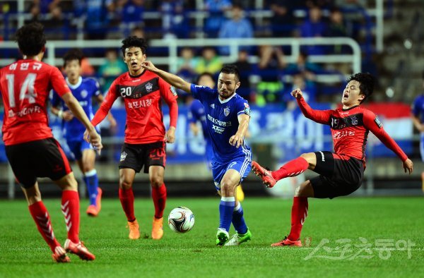 27일 울산 문수월드컵경기장에서 열린 ‘2017 KEB 하나은행 FA CUP’ 울산 현대와 목포시청의 준결승 경기에서 울산 타쿠마가 목포시청 수비수를 제치며 돌파하고 있다.