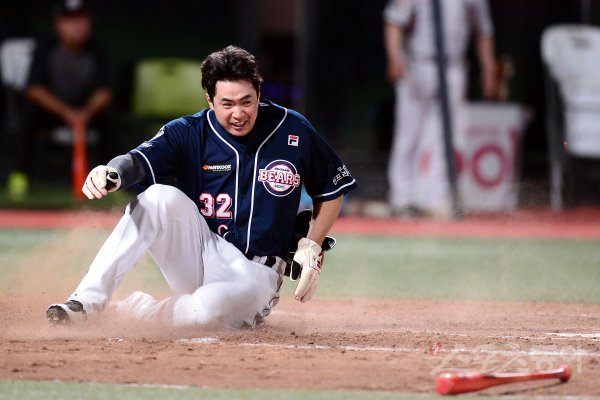 27일 수원kt위즈파크에서 ‘2017 타이어뱅크 KBO 리그’ 두산베어스와 kt위즈 경기가 열렸다. 8회초 1사 1루 두산 양의지 우전 2루타 때 1루주자 김재환이 홈까지 달려 세이프 되고 있다.