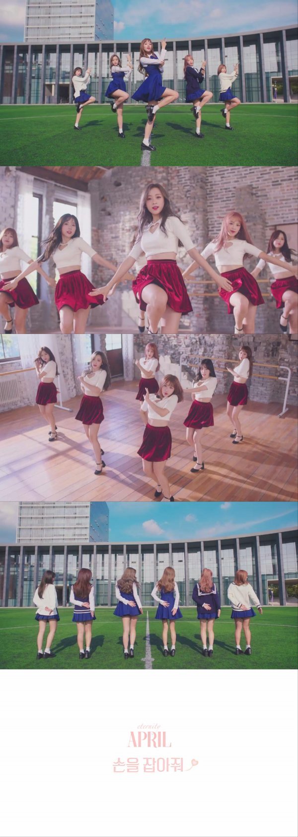 27일 오후6시 소속사 DSP미디어는 에이프릴의 공식 SNS와 유튜브 채널을 통해 네 번째 미니앨범 ‘eternity’의 타이틀 곡 ‘손을 잡아줘’ 안무영상을 공개했다. 영상에는 청명한 가을하늘과 푸르른 배경, 멤버들의 파란 의상이 에이프릴만의 청정한 매력을 극대화 시켰다.