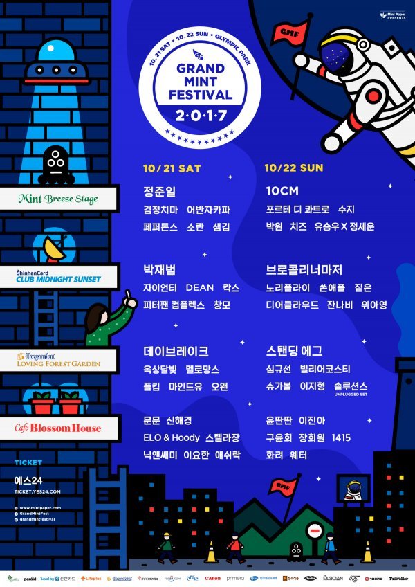오는 10월 21일 토요일, 22일 일요일 양일간 올림픽 공원에서 열리는 그랜드 민트 페스티벌 2017은 검정치마, 노리플라이, 데이브레이크, 브로콜리너마저, 솔루션스, 스탠딩 에그, 10cm, 정준일, 페퍼톤스, 칵스 등 총 51팀이 출연한다. 티켓은 인터파크와 예스24에서, 자세한 정보는 민트페이퍼와 그랜드 민트 페스티벌의 홈페이지 및 SNS에서 확인할 수 있다.