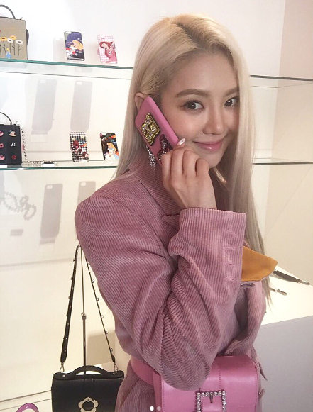 공개된 사진 속 효연은 모든 착장을 핑크로 도배한 모습. 긴 금발 생머리에 핑크색 폰 케이스, 핑크색 자켓, 핑크색 가방을 매치한 효연은 사랑스러움 그 자체다.
