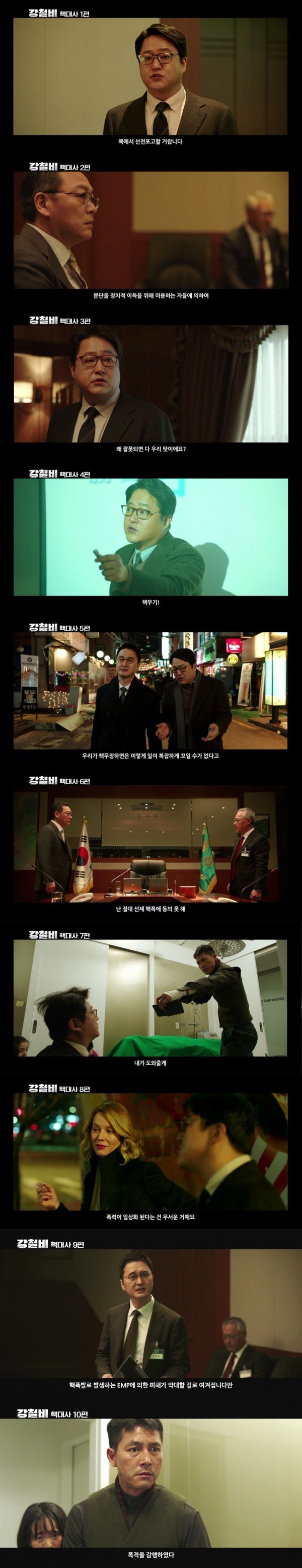 2017년 12월, 대한민국에 가장 강력한 화두를 던질 영화 ‘강철비’가 역대급 행보를 알렸다. 영화의 핵심이 담긴 ‘핵대사 클립’ 10종을 추석 연휴 동안 공개하기로 한 것.