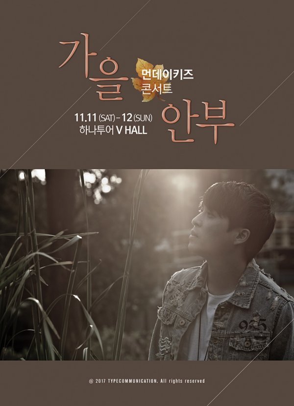 그는 약 4년 만에 개최하는 콘서트 ‘가을 안부’를 통해 그동안 많은 사랑을 받았던 먼데이키즈의 히트곡들은 물론 얼어붙은 마음을 녹여줄 따뜻한 노래들로 관객들의 늦가을 감성을 정조준할 계획이다.