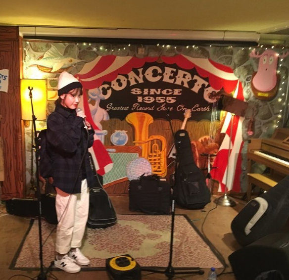 공개된 사진 속 아이유는 빈티지한 무대 앞에서 마이크를 두 손으로 쥔 모습. 앞을 흘끗 바라보며 눈치를 보는 모습이 귀여움을 자아냈다.